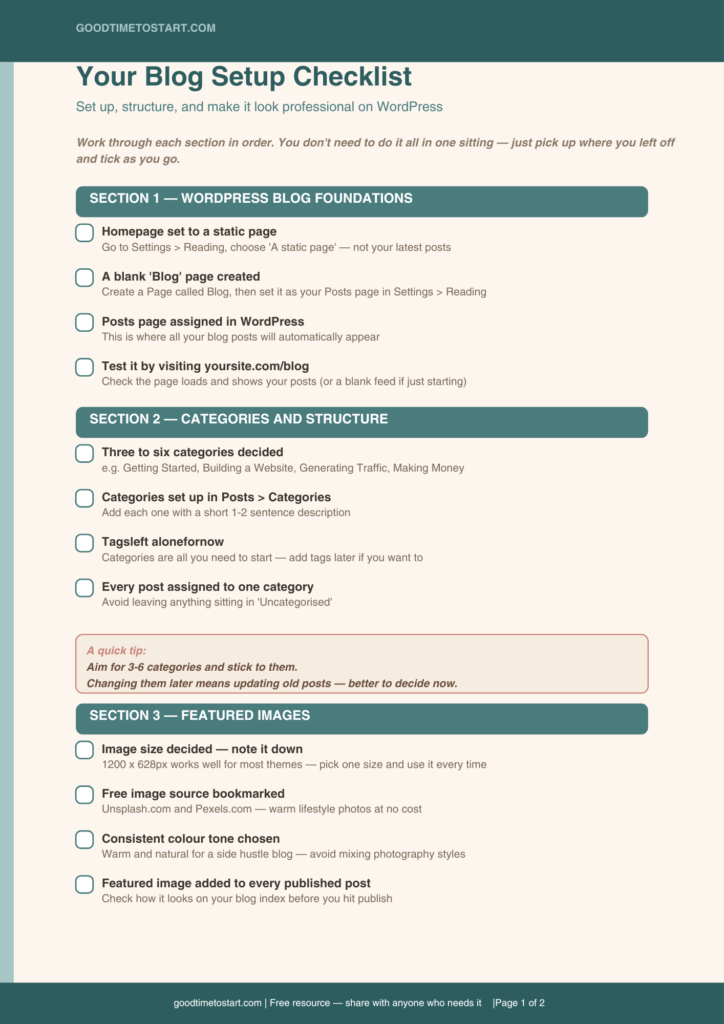 The Start Here page is worth a mention on its own. This is a page, not a post, that acts as a guided introduction to your site for brand new visitors. It might say something like: ‘Not sure where to begin? Start here.’ and then link to your three or four most important posts in logical order. It’s one of the most effective things you can add to a beginner blog, and it costs nothing but a little time to write.